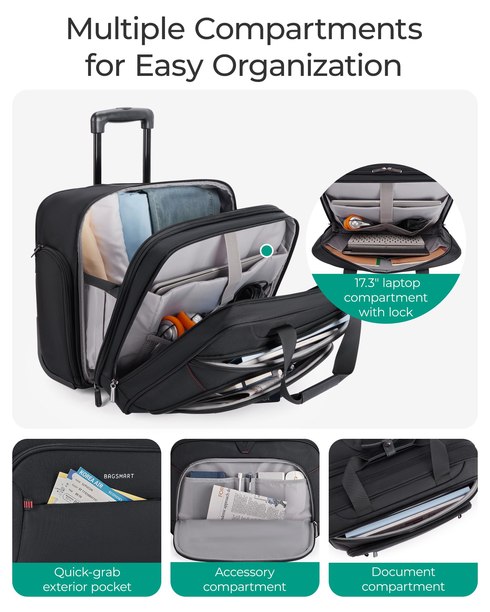 - Versatile & Travel-Friendly: Ideal for both business trips and personal travel, this BAGSMART rolling laptop bag fits most airline overhead bins and meets carry-on size requirements. The padded compartment ensures the safety of your 17.3" laptop.
